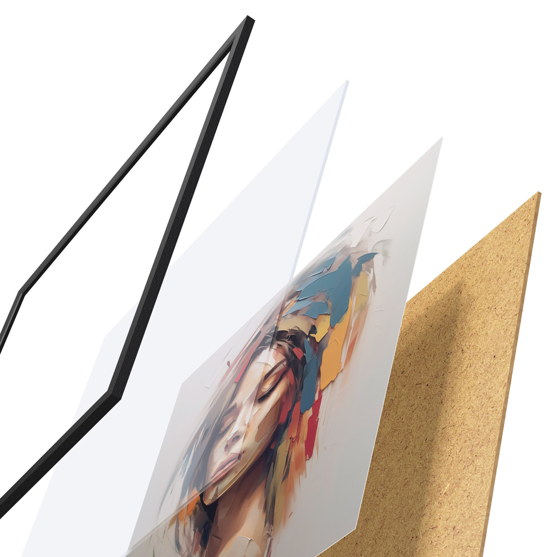 Plakat składa się z ramy, pleksi, wydrukowanego obrazu i podkładu z płyty wiórowej. Plakat można natychmiast zawiesić na ścianie dzięki uchwytom z tyłu.