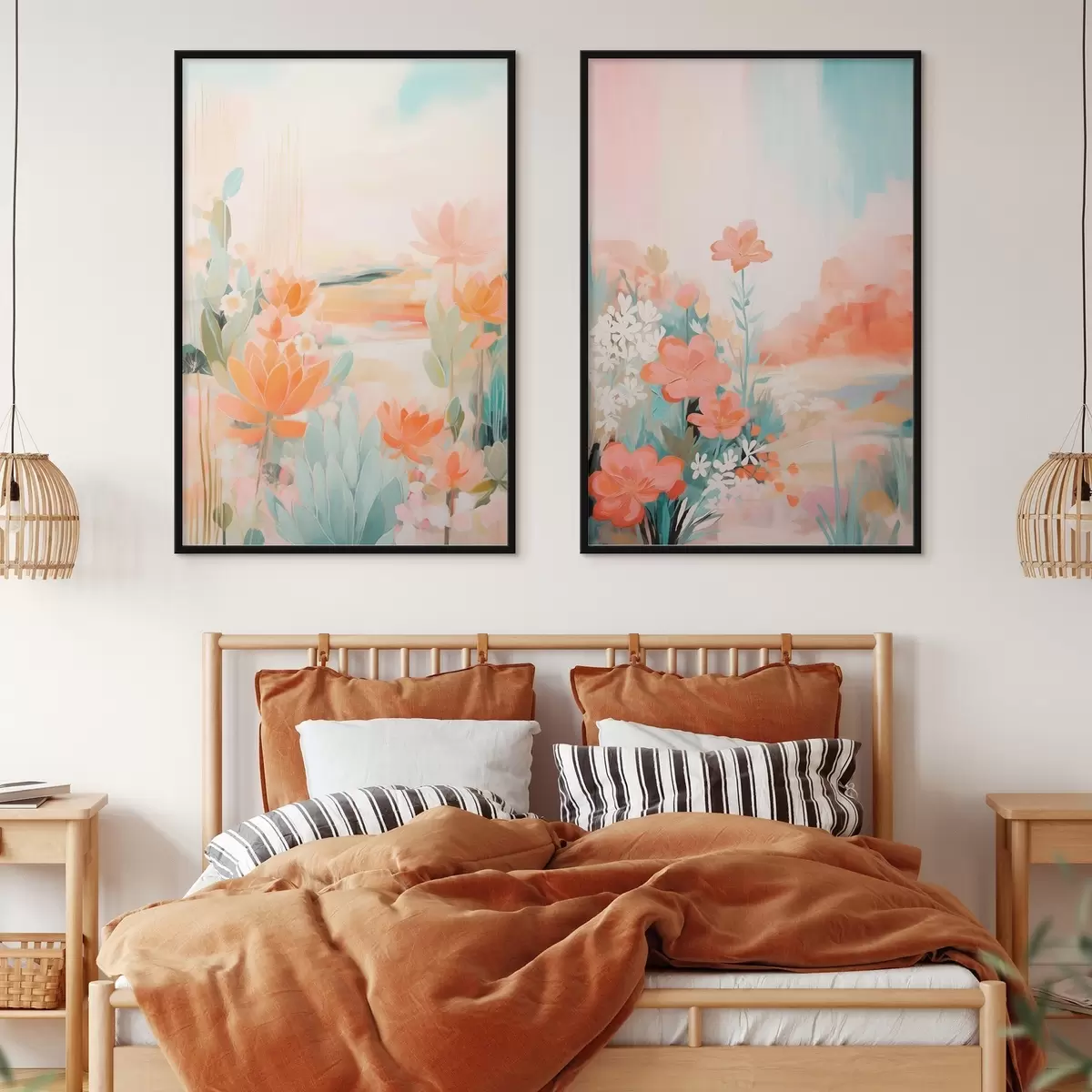 Plakat Motywy kwiatowe w pastelowych odcieniach na tle lekko zamglonej doliny d01085
