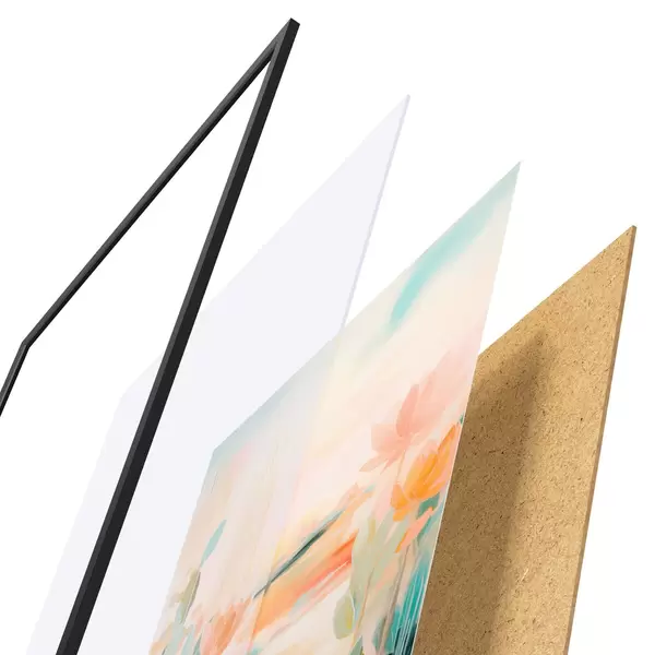 Plakat składa się z ramy, pleksi, wydrukowanego obrazu i podkładu z płyty wiórowej. Plakat można natychmiast zawiesić na ścianie dzięki uchwytom z tyłu.