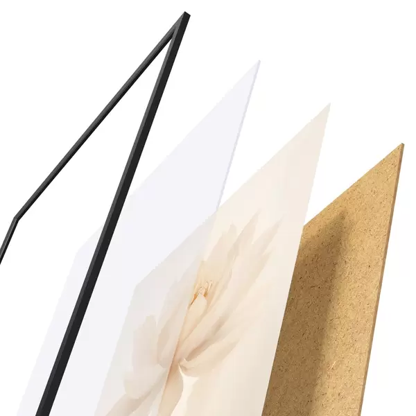 Plakat składa się z ramy, pleksi, wydrukowanego obrazu i podkładu z płyty wiórowej. Plakat można natychmiast zawiesić na ścianie dzięki uchwytom z tyłu.