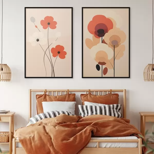 Poster Minimalistyczny dyptyk kwiatowy w ciepłych odcieniach beżu i koralowca z graficznymi liniami Nr d01090