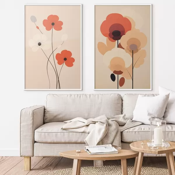 Plakat Minimalistyczny dyptyk kwiatowy w ciepłych odcieniach beżu i koralowca z graficznymi liniami d01090