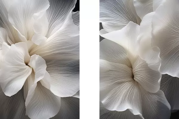 Plakat Zbliżenie na delikatne, abstrakcyjne białe płatki kwiatów o skomplikowanych liniach i zamazanym ciemnym tle. d01117