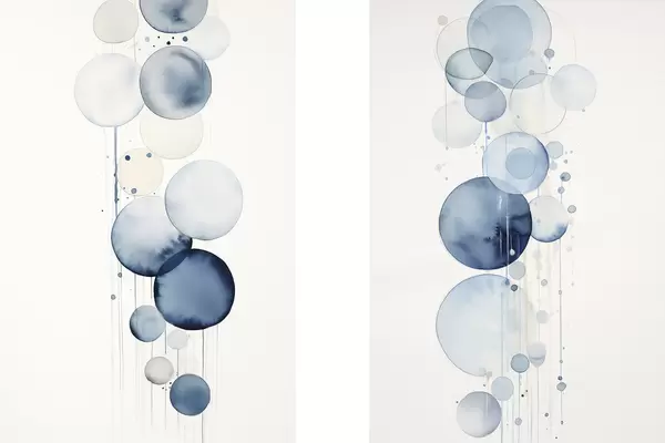 Plakat Abstrakcyjne, teksturowane niebiesko-białe koła o różnych rozmiarach, namalowane akwarelą na białym tle. d01118