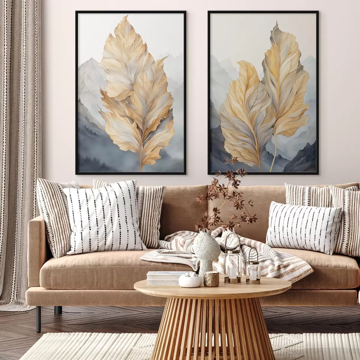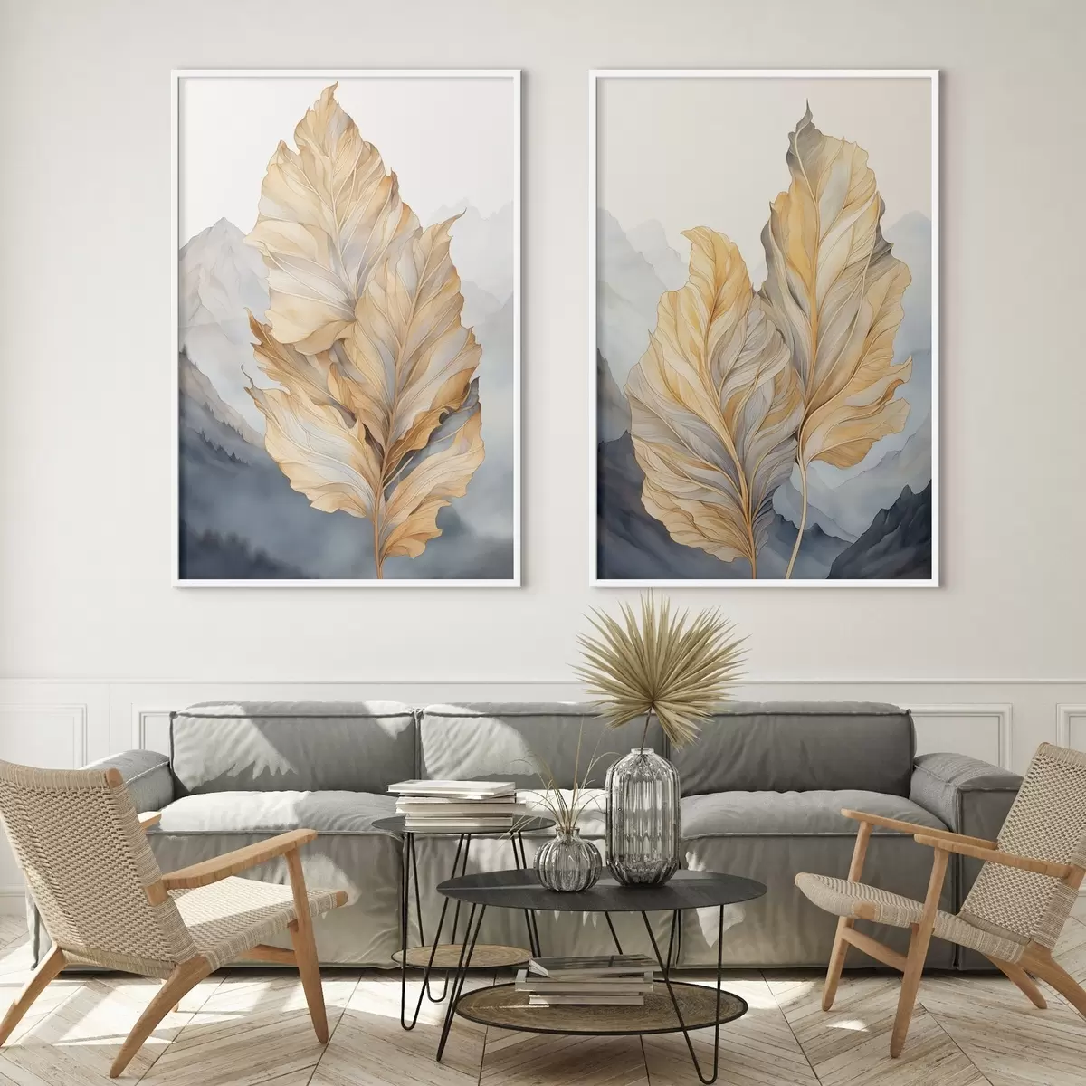 Plakat Abstrakcyjne, duże, żółte i brązowe liście o skomplikowanych szczegółach na tle górskiego krajobrazu. d01119