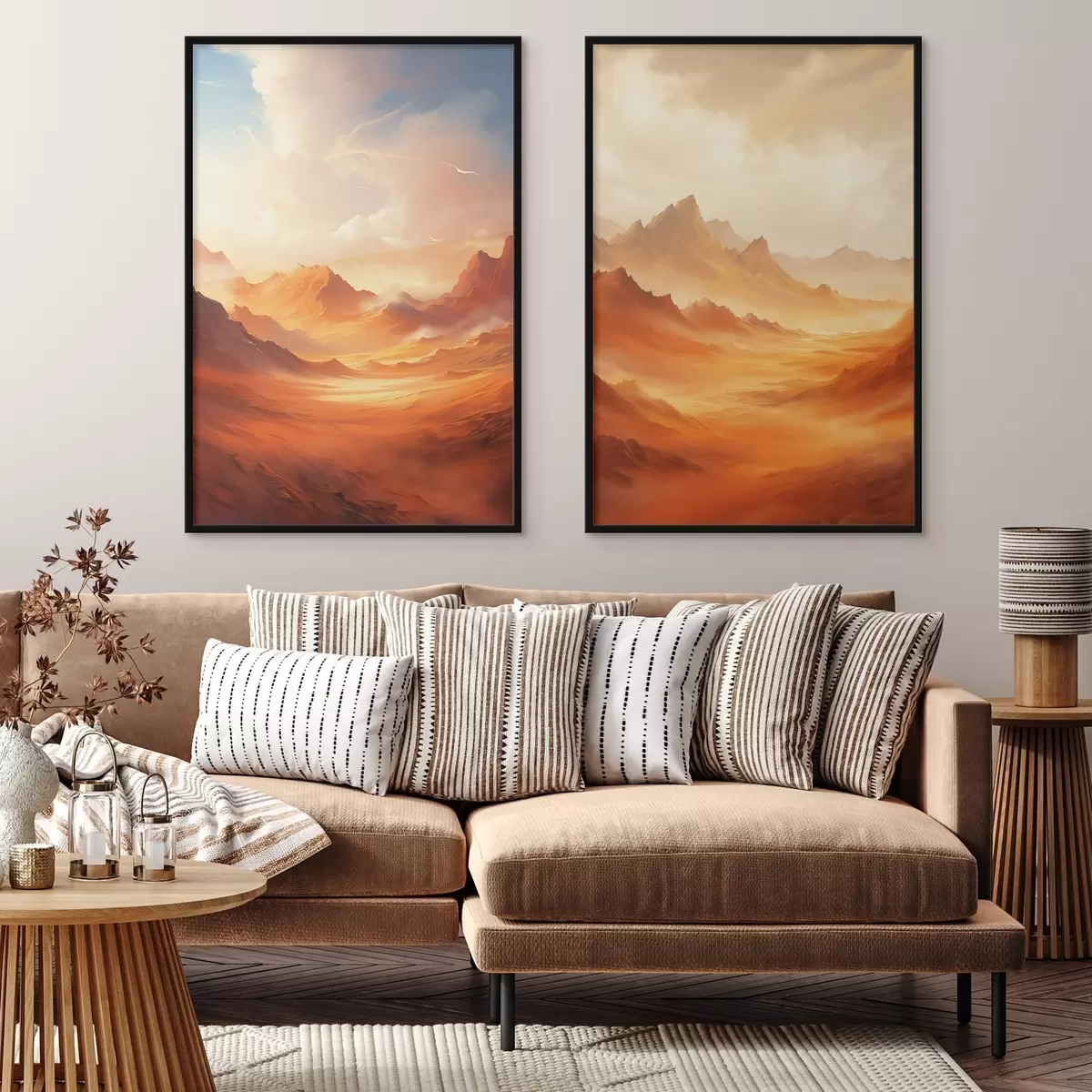 Plakat Rozległy, pomarańczowy krajobraz pustynny z wysokimi, skalistymi górami pod zamglonym, nasłonecznionym niebem z rzadkimi chmurami. d01122