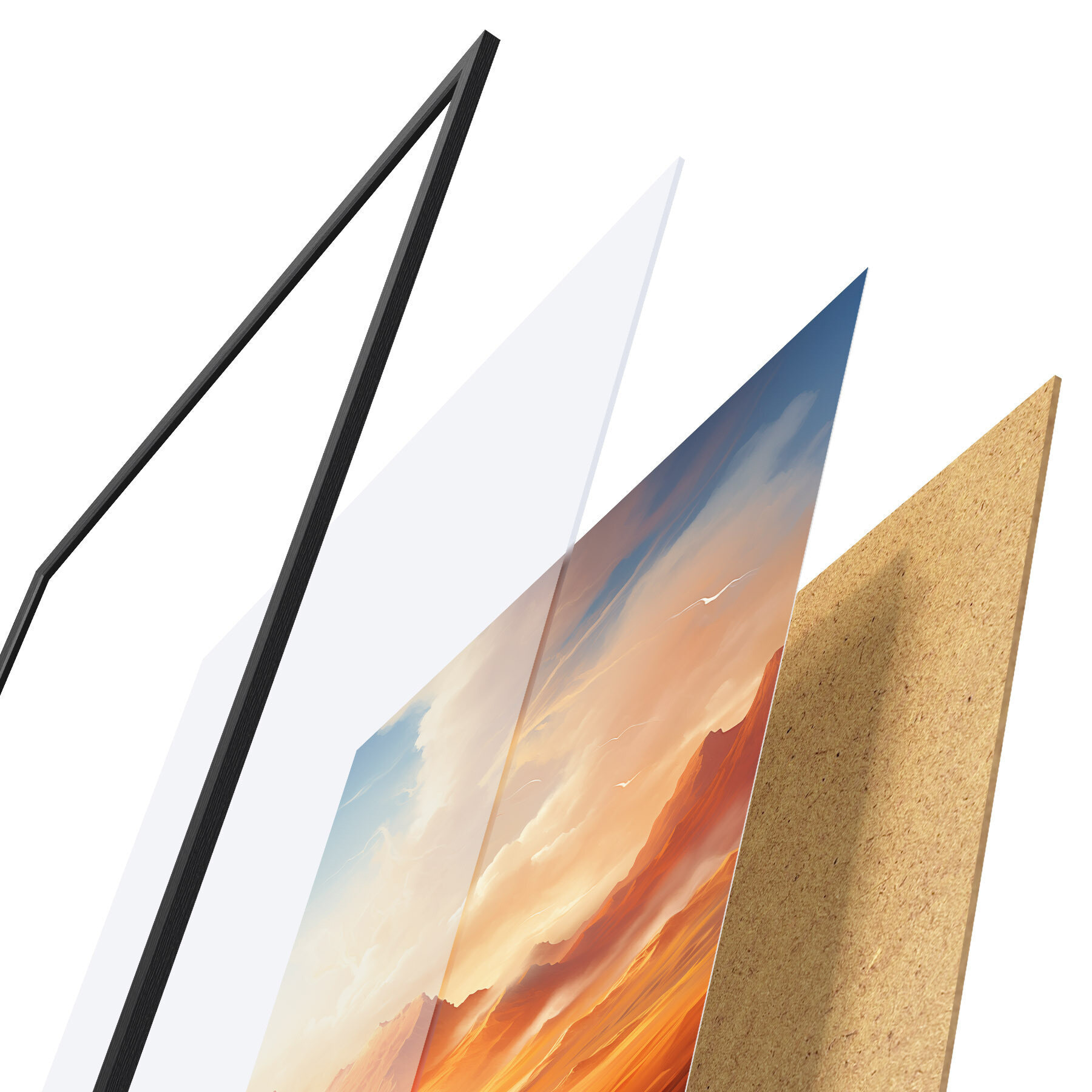 Plakat składa się z ramy, pleksi, wydrukowanego obrazu i podkładu z płyty wiórowej. Plakat można natychmiast zawiesić na ścianie dzięki uchwytom z tyłu.