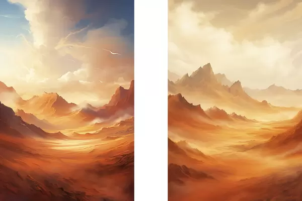 Plakat Rozległy, pomarańczowy krajobraz pustynny z wysokimi, skalistymi górami pod zamglonym, nasłonecznionym niebem z rzadkimi chmurami. d01122