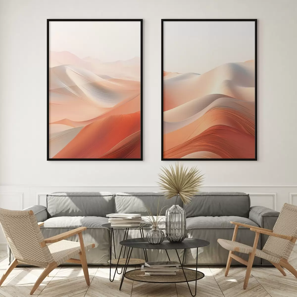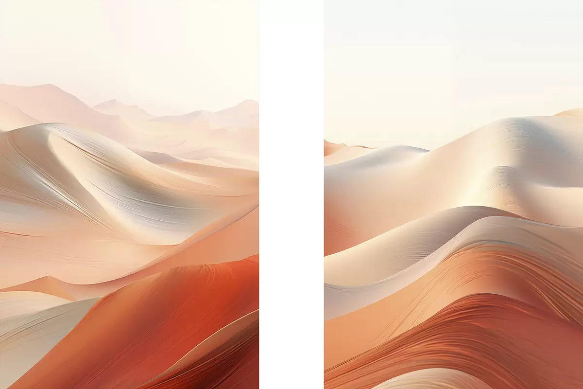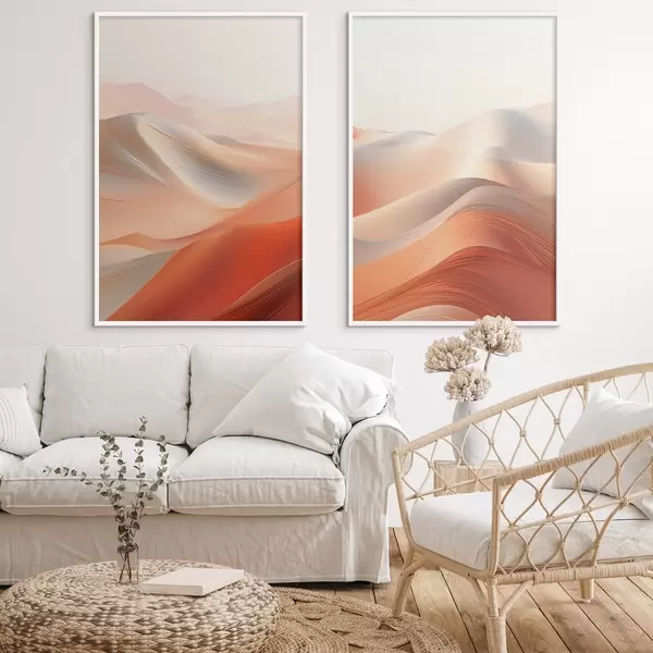 Plakat Abstrakcyjny krajobraz pustynny z płynącymi wydmami w ciepłych odcieniach pomarańczy i bieli. d01123