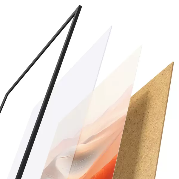 Plakat składa się z ramy, pleksi, wydrukowanego obrazu i podkładu z płyty wiórowej. Plakat można natychmiast zawiesić na ścianie dzięki uchwytom z tyłu.