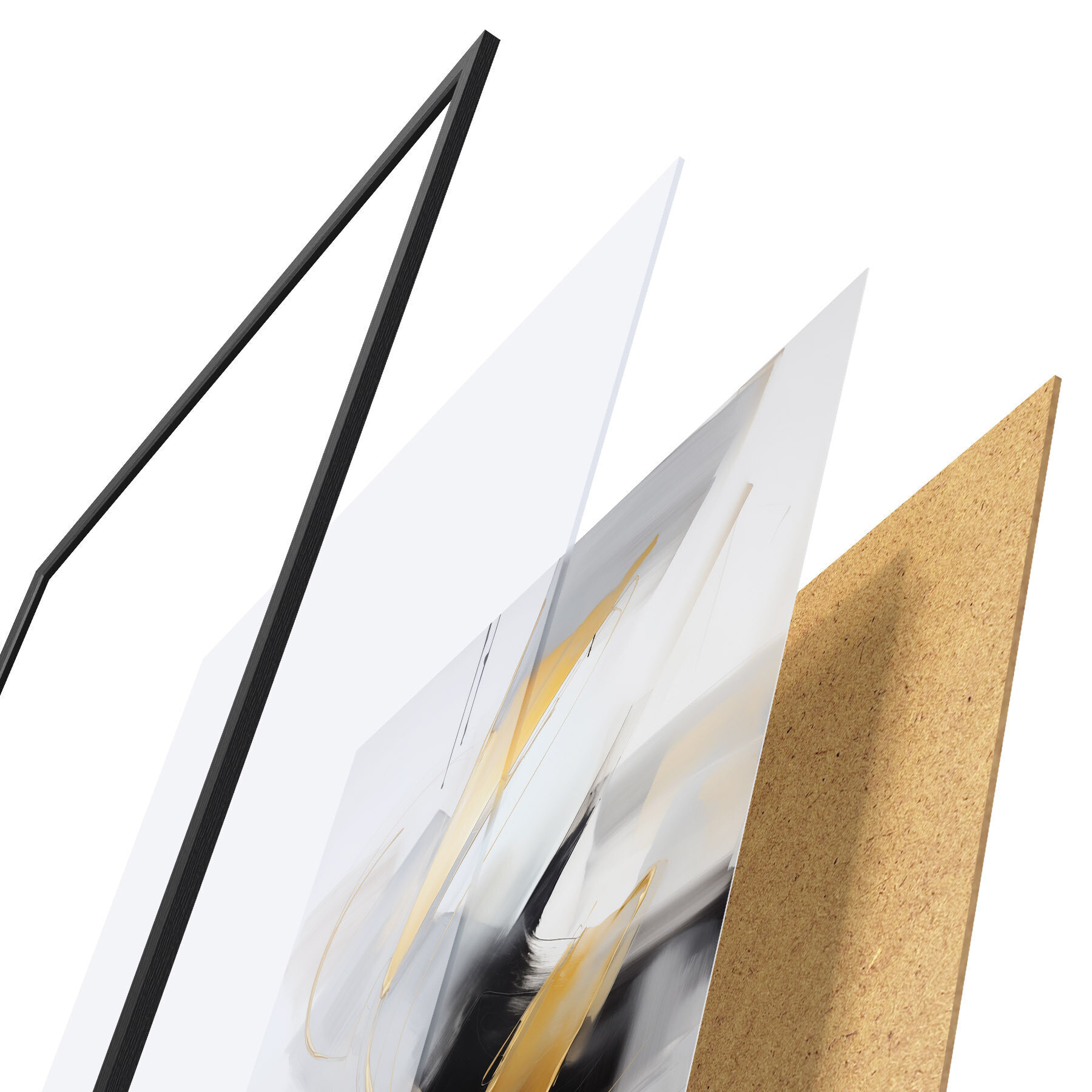 Plakat składa się z ramy, pleksi, wydrukowanego obrazu i podkładu z płyty wiórowej. Plakat można natychmiast zawiesić na ścianie dzięki uchwytom z tyłu.