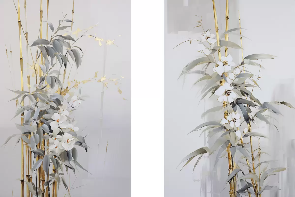 Poster Abstrakcyjne łodygi bambusa z żółtymi akcentami, delikatnymi białymi kwiatami i jasnozielonymi liśćmi, szare tło Nr d01127