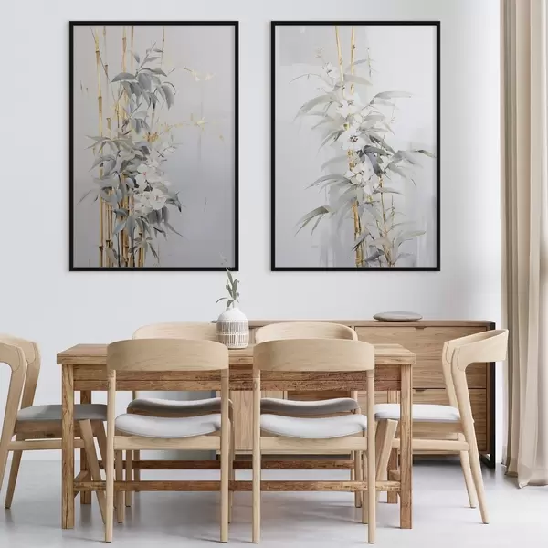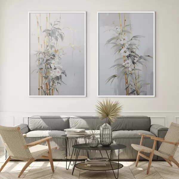 Plakat Abstrakcyjne łodygi bambusa z żółtymi akcentami, delikatnymi białymi kwiatami i jasnozielonymi liśćmi, szare tło d01127