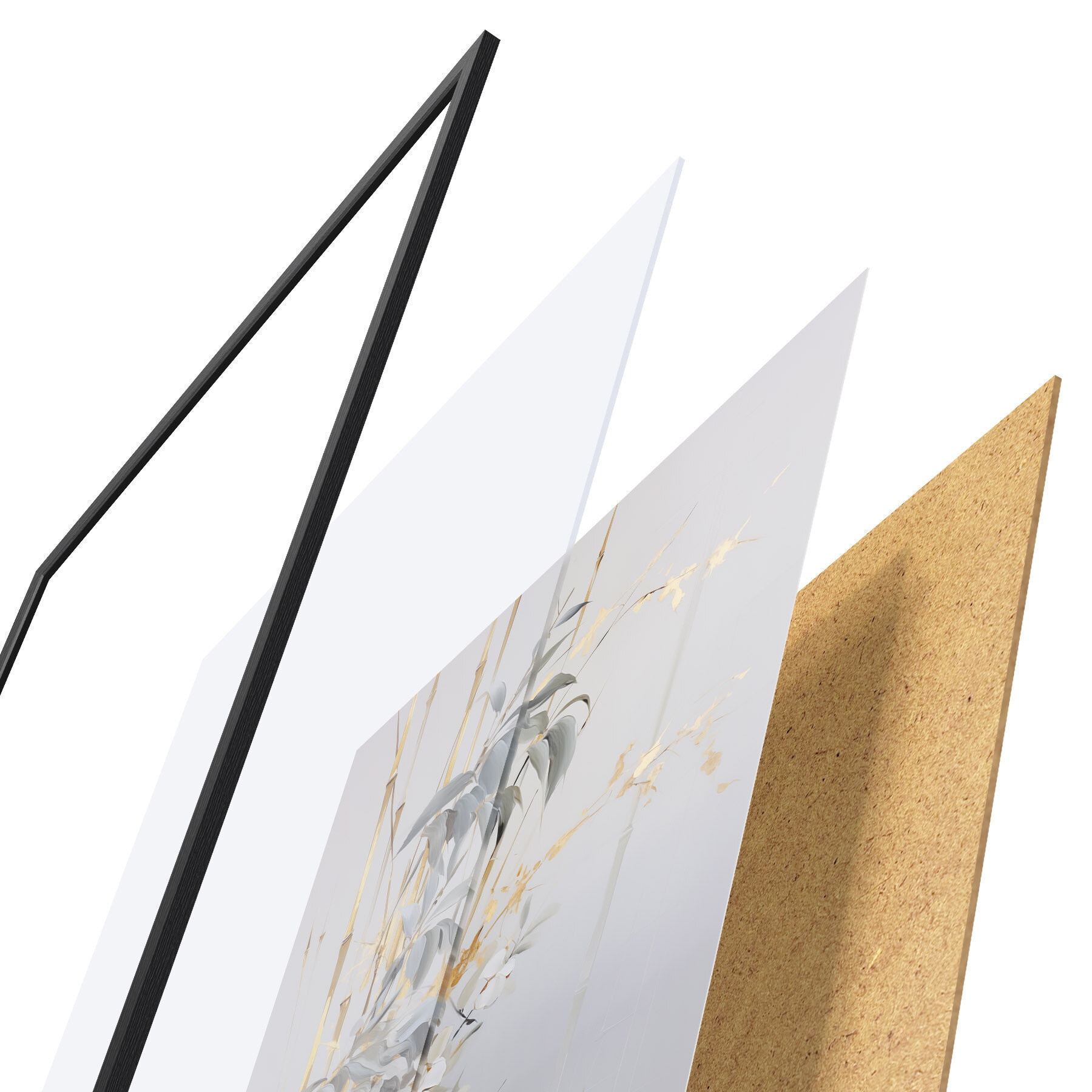 Plakat składa się z ramy, pleksi, wydrukowanego obrazu i podkładu z płyty wiórowej. Plakat można natychmiast zawiesić na ścianie dzięki uchwytom z tyłu.