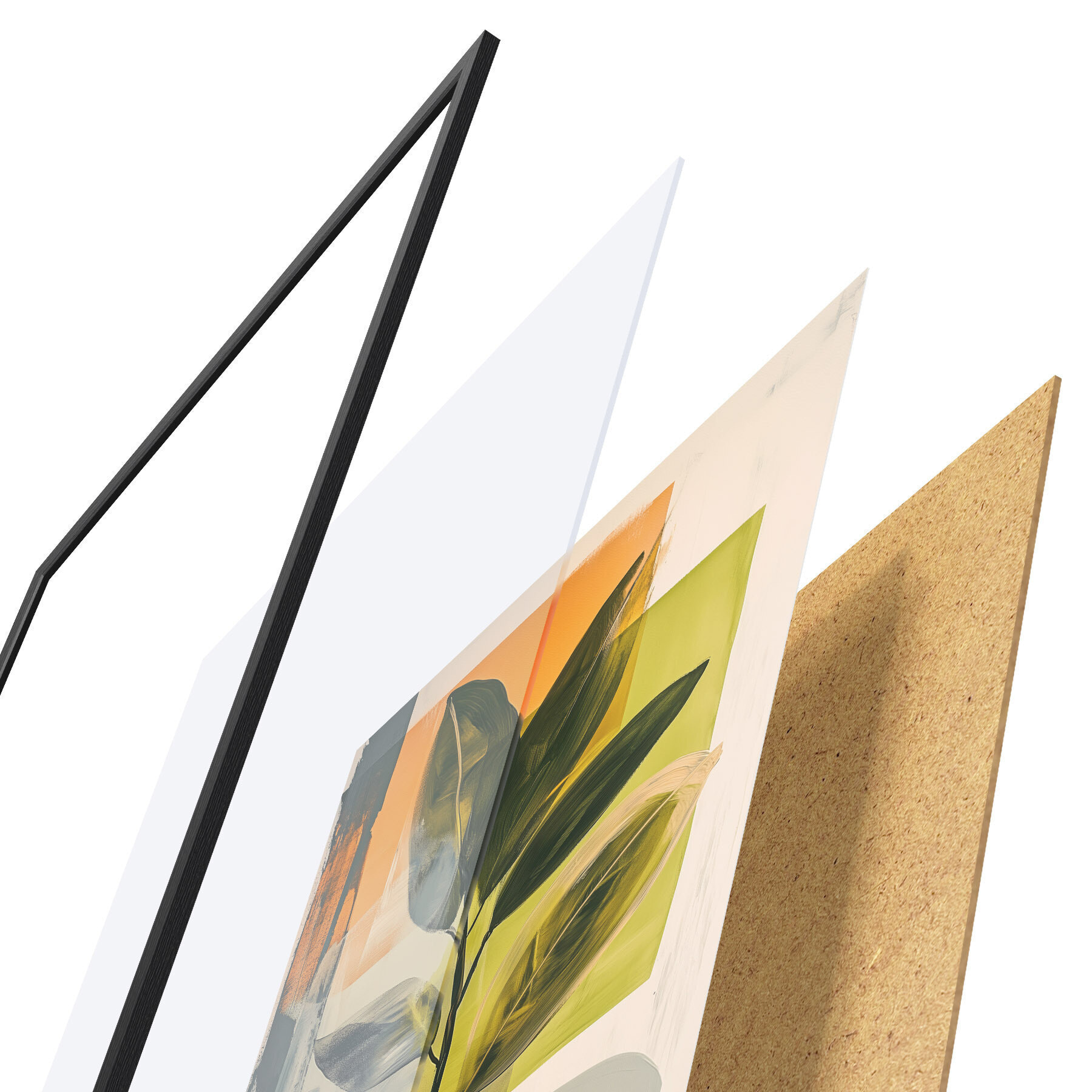 Plakat składa się z ramy, pleksi, wydrukowanego obrazu i podkładu z płyty wiórowej. Plakat można natychmiast zawiesić na ścianie dzięki uchwytom z tyłu.