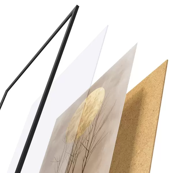 Plakat składa się z ramy, pleksi, wydrukowanego obrazu i podkładu z płyty wiórowej. Plakat można natychmiast zawiesić na ścianie dzięki uchwytom z tyłu.