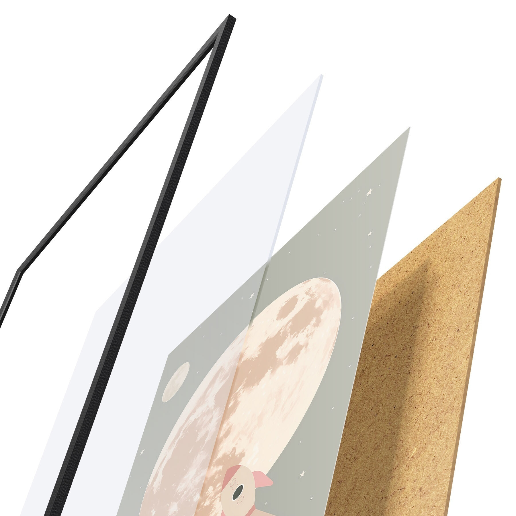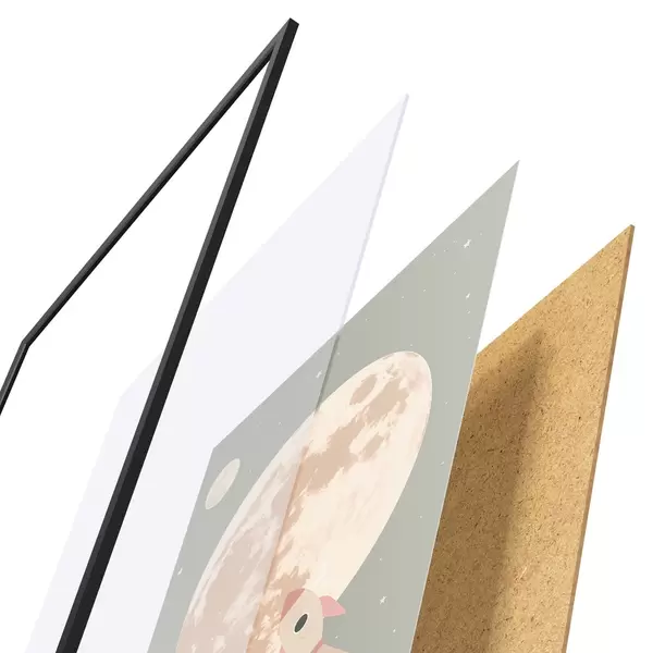 Plakat składa się z ramy, pleksi, wydrukowanego obrazu i podkładu z płyty wiórowej. Plakat można natychmiast zawiesić na ścianie dzięki uchwytom z tyłu.