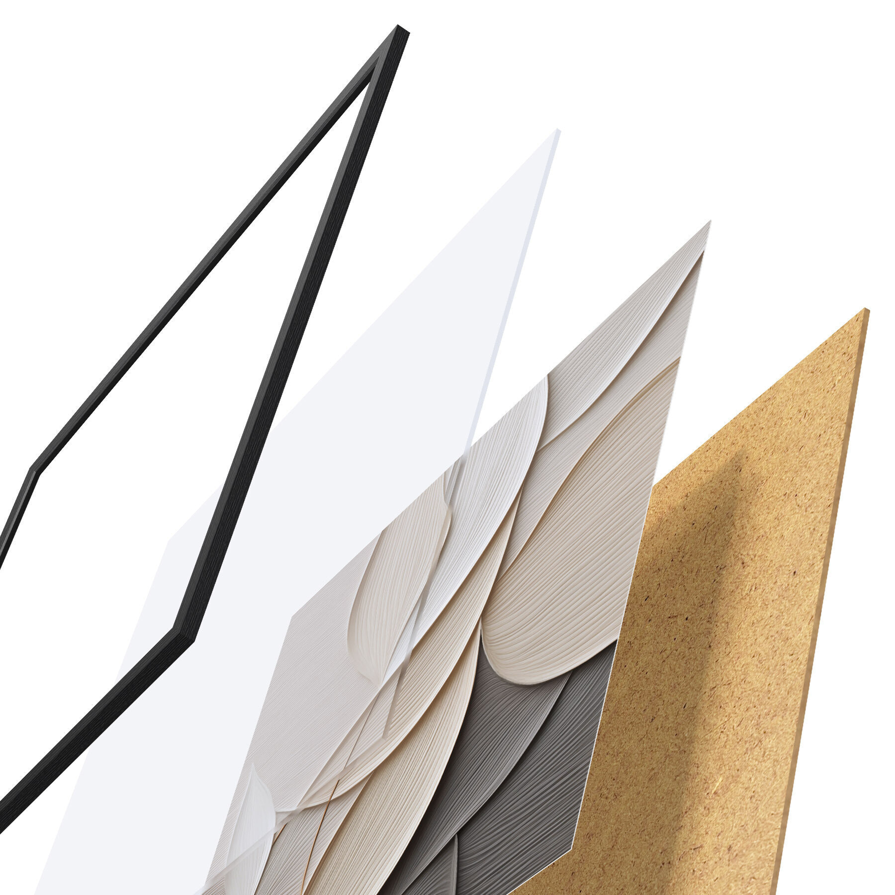 Plakat składa się z ramy, pleksi, wydrukowanego obrazu i podkładu z płyty wiórowej. Plakat można natychmiast zawiesić na ścianie dzięki uchwytom z tyłu.
