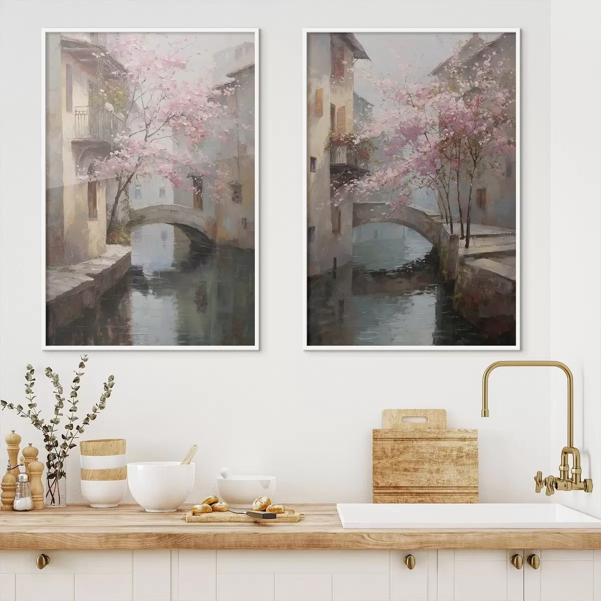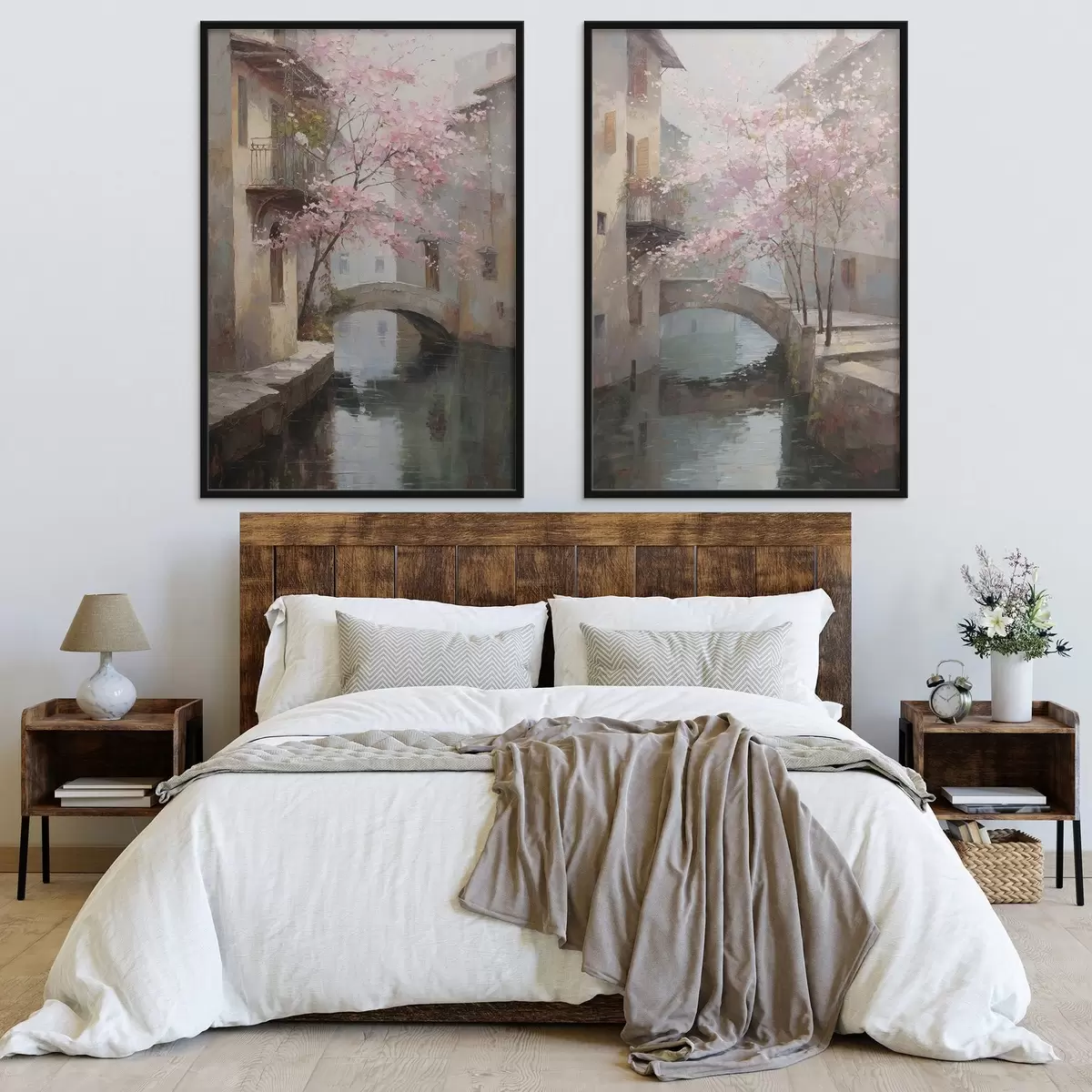 Poster romantyczny pejzaż miejski z kwitnącym drzewem w stylu malarstwa olejnego Nr d01173