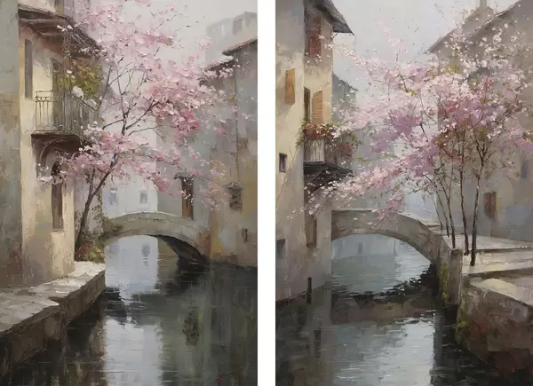 Poster romantyczny pejzaż miejski z kwitnącym drzewem w stylu malarstwa olejnego Nr d01173