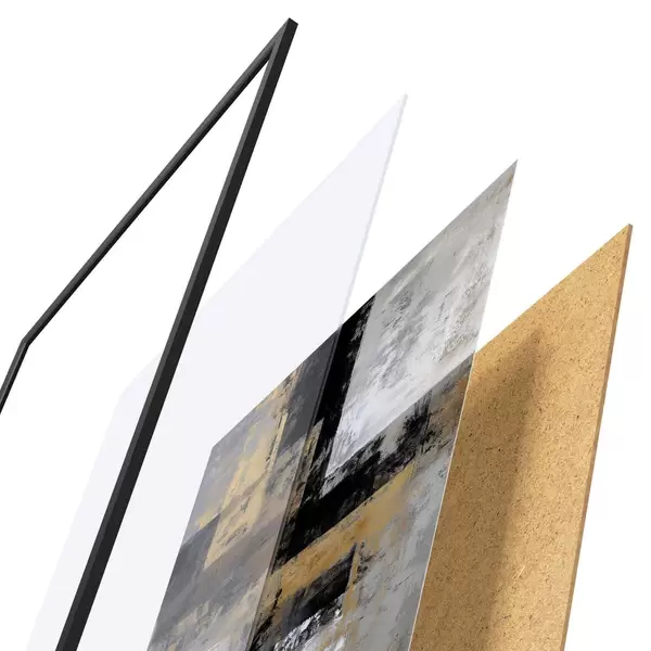 Plakat składa się z ramy, pleksi, wydrukowanego obrazu i podkładu z płyty wiórowej. Plakat można natychmiast zawiesić na ścianie dzięki uchwytom z tyłu.