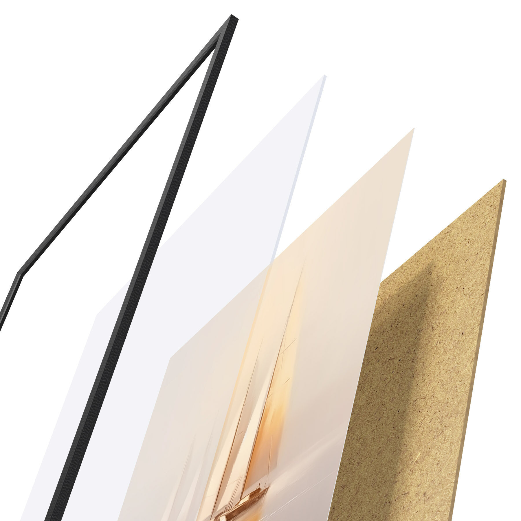 Plakat składa się z ramy, pleksi, wydrukowanego obrazu i podkładu z płyty wiórowej. Plakat można natychmiast zawiesić na ścianie dzięki uchwytom z tyłu.