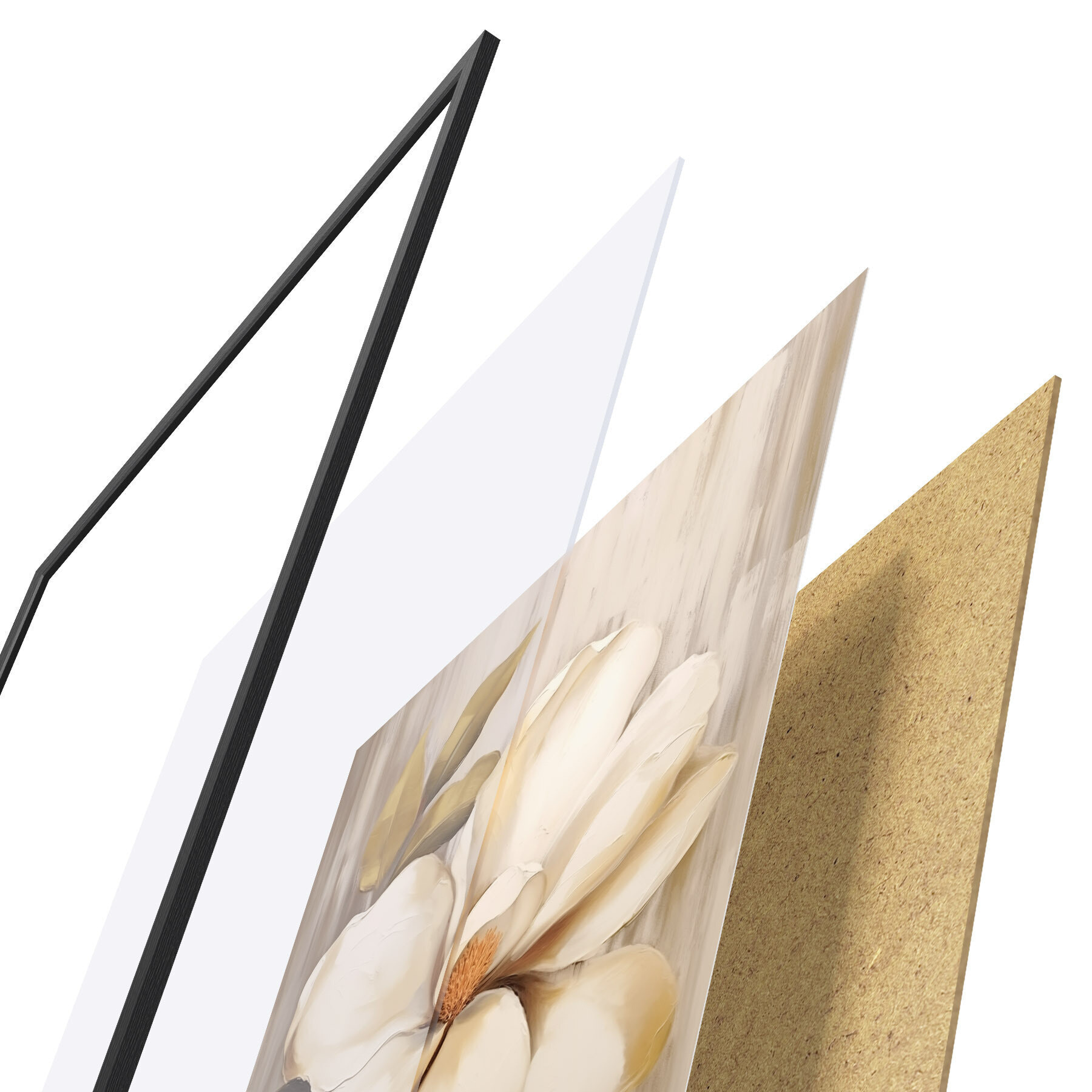 Plakat składa się z ramy, pleksi, wydrukowanego obrazu i podkładu z płyty wiórowej. Plakat można natychmiast zawiesić na ścianie dzięki uchwytom z tyłu.