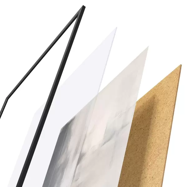 Plakat składa się z ramy, pleksi, wydrukowanego obrazu i podkładu z płyty wiórowej. Plakat można natychmiast zawiesić na ścianie dzięki uchwytom z tyłu.