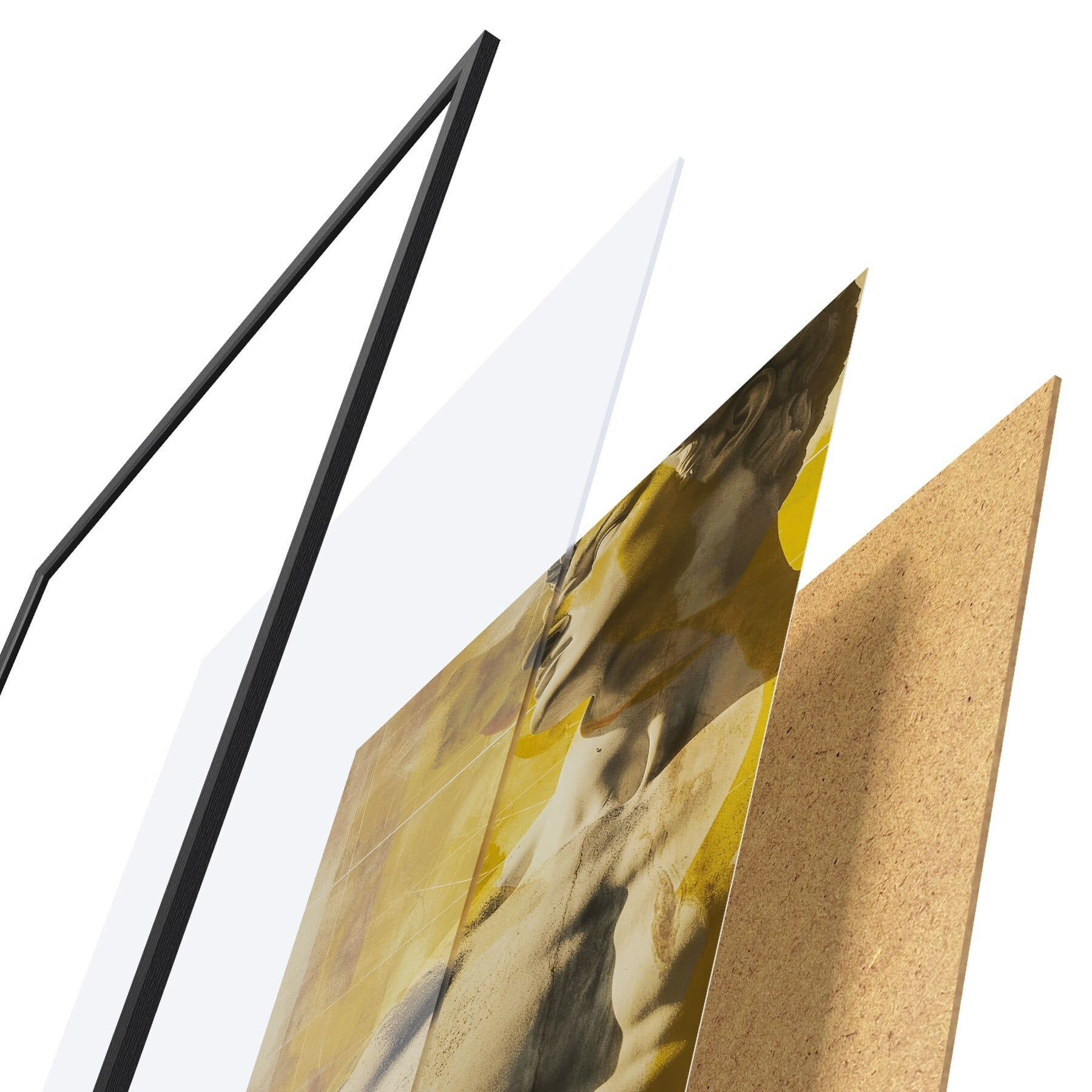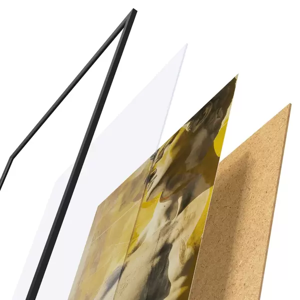 Plakat składa się z ramy, pleksi, wydrukowanego obrazu i podkładu z płyty wiórowej. Plakat można natychmiast zawiesić na ścianie dzięki uchwytom z tyłu.