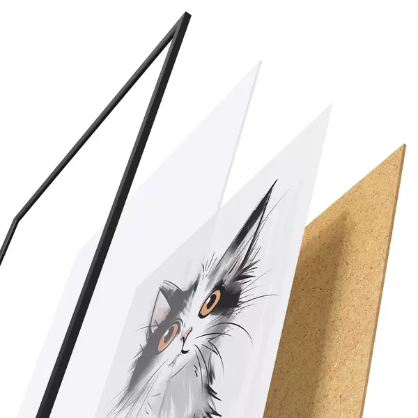 Plakat składa się z ramy, pleksi, wydrukowanego obrazu i podkładu z płyty wiórowej. Plakat można natychmiast zawiesić na ścianie dzięki uchwytom z tyłu.