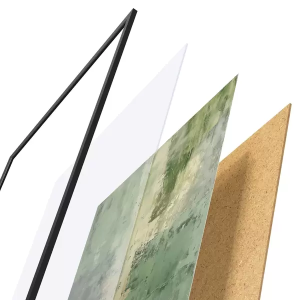 Plakat składa się z ramy, pleksi, wydrukowanego obrazu i podkładu z płyty wiórowej. Plakat można natychmiast zawiesić na ścianie dzięki uchwytom z tyłu.