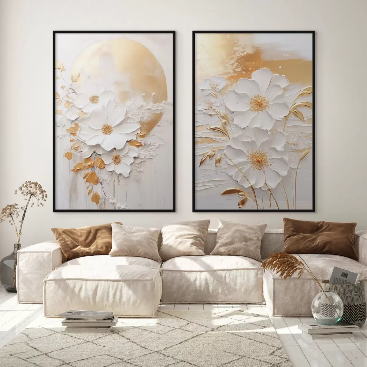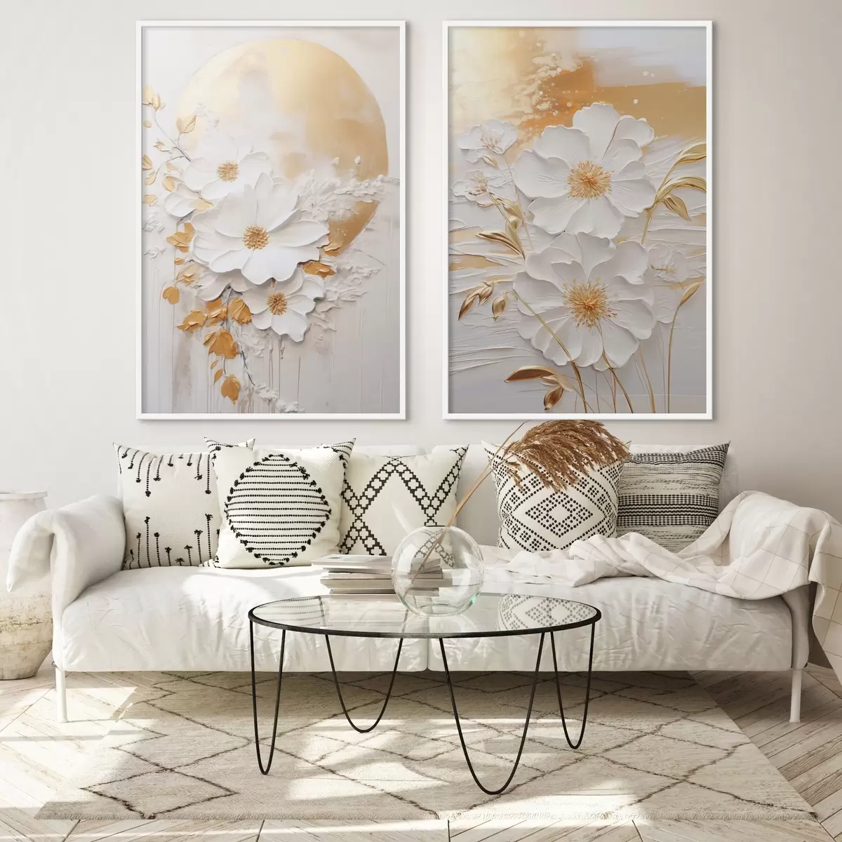 Plakat Białe kwiaty z żółtymi akcentami i delikatnymi liśćmi na teksturowanym tle, sztuka współczesna d01233