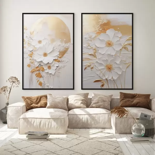 Poster Białe kwiaty z żółtymi akcentami i delikatnymi liśćmi na teksturowanym tle, sztuka współczesna Nr d01233
