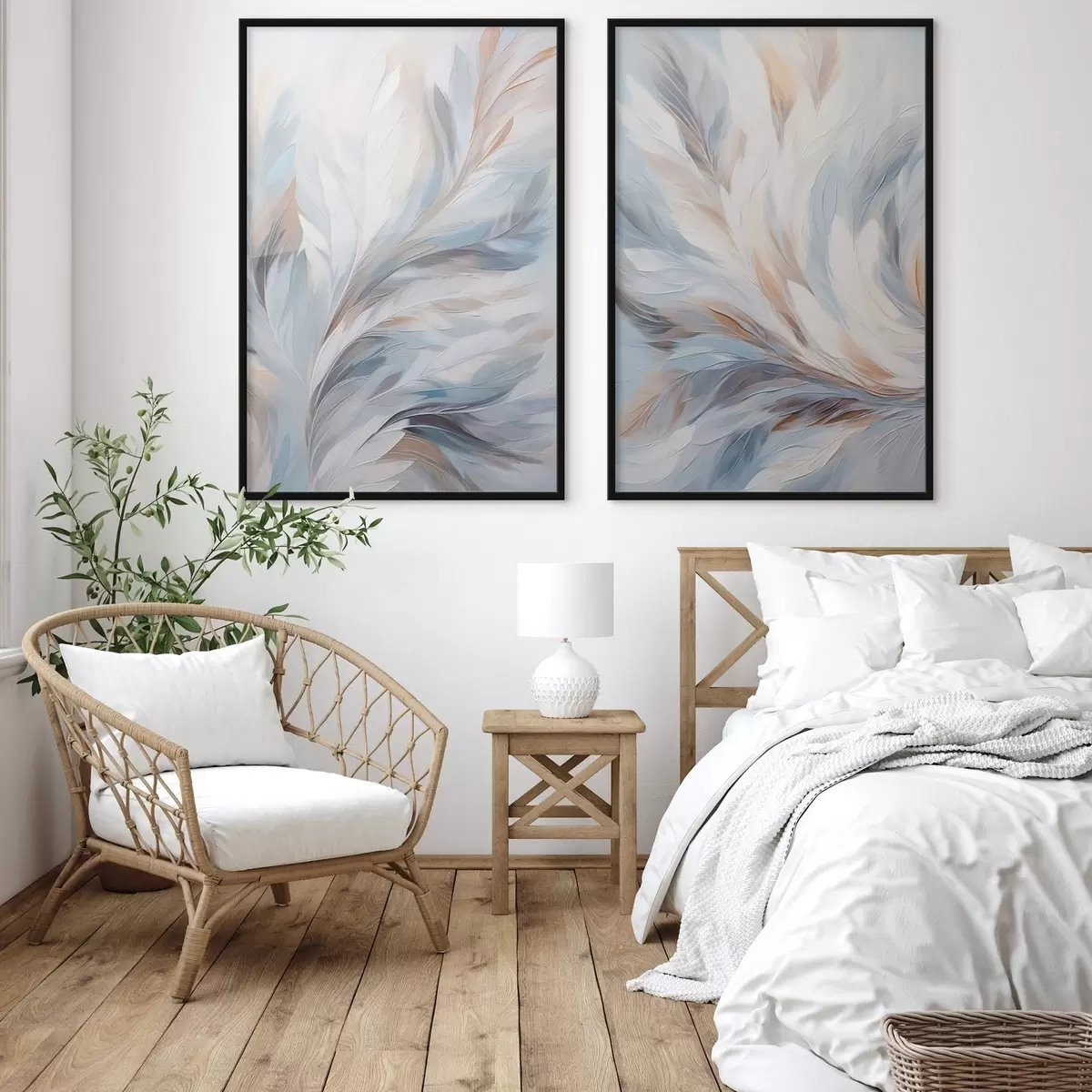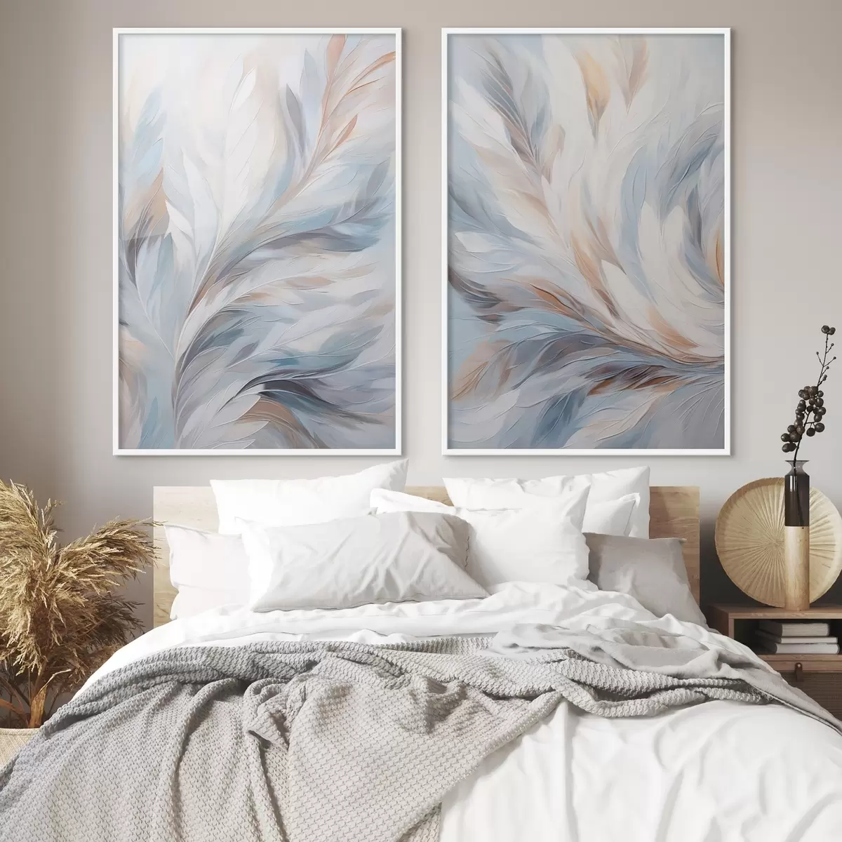 Plakat Abstrakcyjny obraz przedstawiający pióra w odcieniach bieli, błękitu i brązu, o miękkiej, płynnej fakturze i jasnym tle. d01234