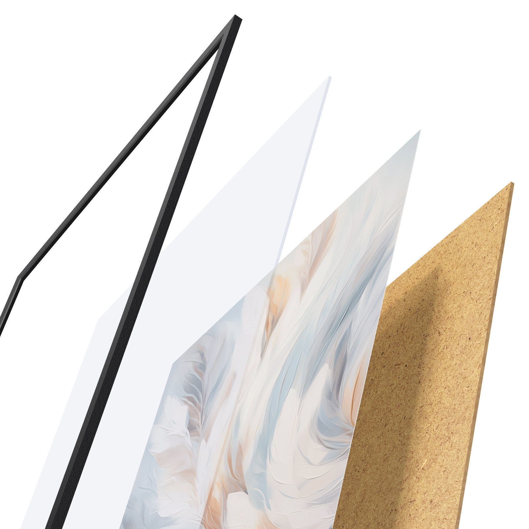 Plakat składa się z ramy, pleksi, wydrukowanego obrazu i podkładu z płyty wiórowej. Plakat można natychmiast zawiesić na ścianie dzięki uchwytom z tyłu.