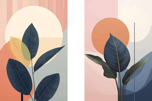 Plakat Ciemne liście na tle abstrakcyjnych kształtów w kolorze brzoskwiniowym i szarym z dużym, jasnożółtym okręgiem d01238