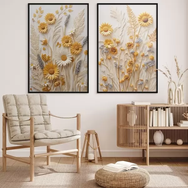 Plakat Teksturowana kolekcja żółtych i białych stokrotek z suszonymi trawami i gałązkami lawendy na białym tle. d01241