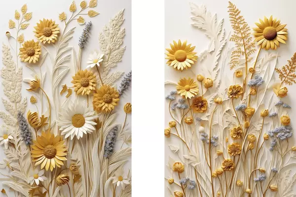 Plakat Teksturowana kolekcja żółtych i białych stokrotek z suszonymi trawami i gałązkami lawendy na białym tle. d01241