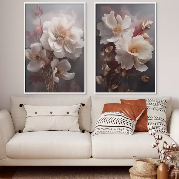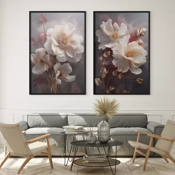 Plakat Delikatne piwonie o cienkich, delikatnych płatkach, otoczone ciemnoczerwonymi i żółtymi liśćmi na abstrakcyjnym tle. d01243