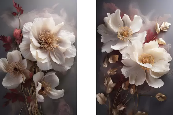 Plakat Delikatne piwonie o cienkich, delikatnych płatkach, otoczone ciemnoczerwonymi i żółtymi liśćmi na abstrakcyjnym tle. d01243