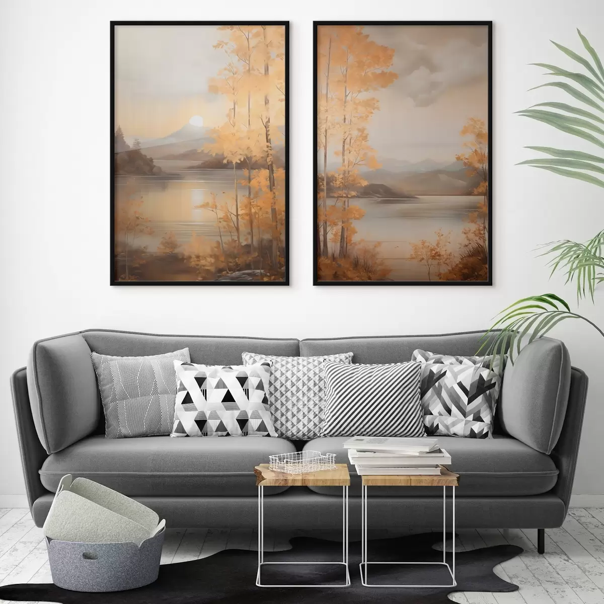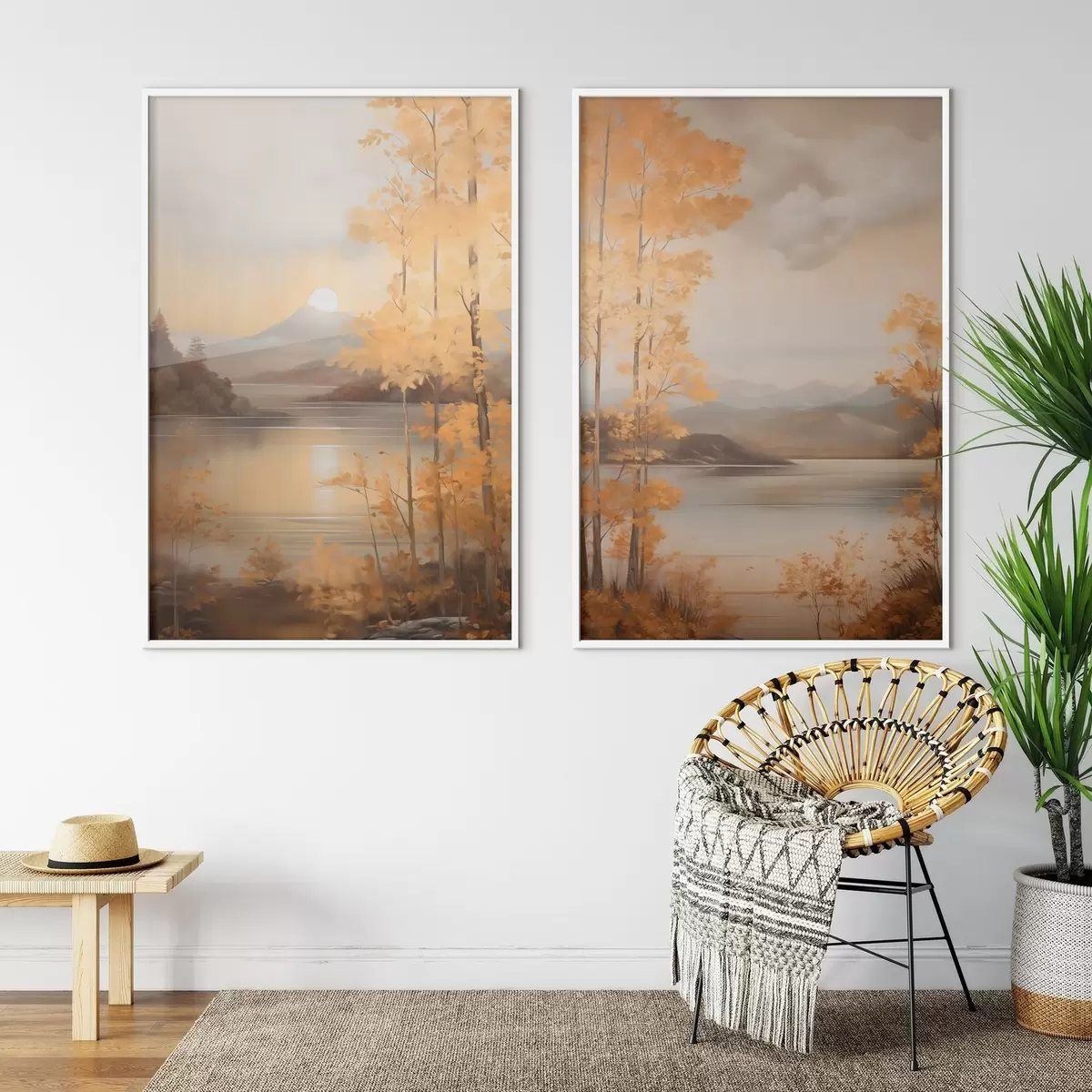 Plakat Jesienne drzewa o pomarańczowych liściach otaczają spokojne jezioro z odległymi górami pod zachmurzonym niebem. d01246