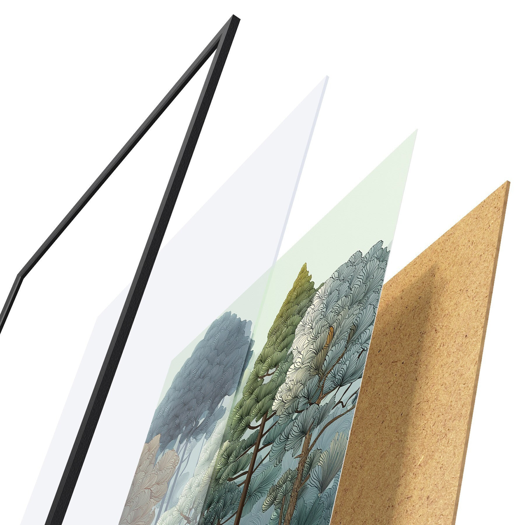 Plakat składa się z ramy, pleksi, wydrukowanego obrazu i podkładu z płyty wiórowej. Plakat można natychmiast zawiesić na ścianie dzięki uchwytom z tyłu.