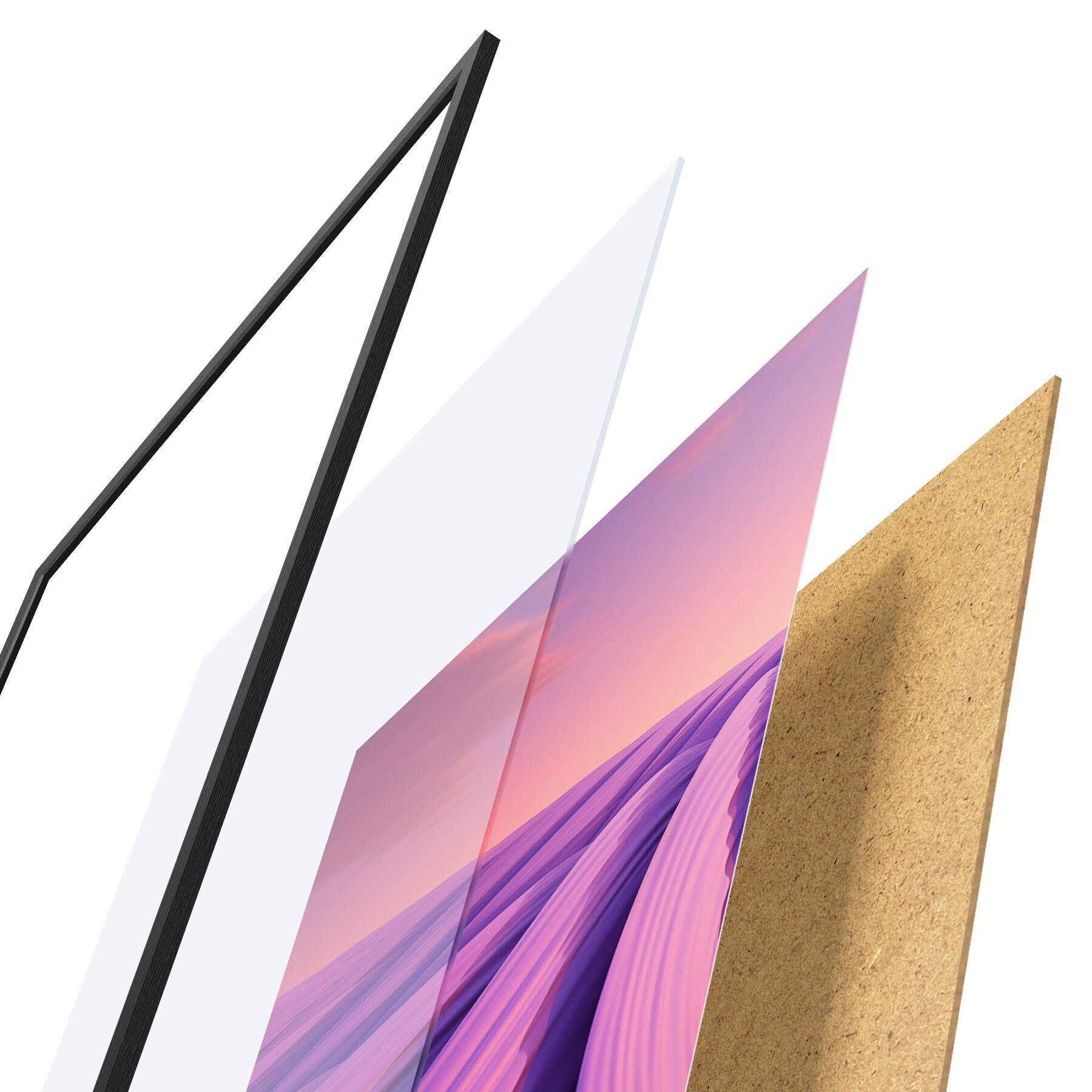 Plakat składa się z ramy, pleksi, wydrukowanego obrazu i podkładu z płyty wiórowej. Plakat można natychmiast zawiesić na ścianie dzięki uchwytom z tyłu.