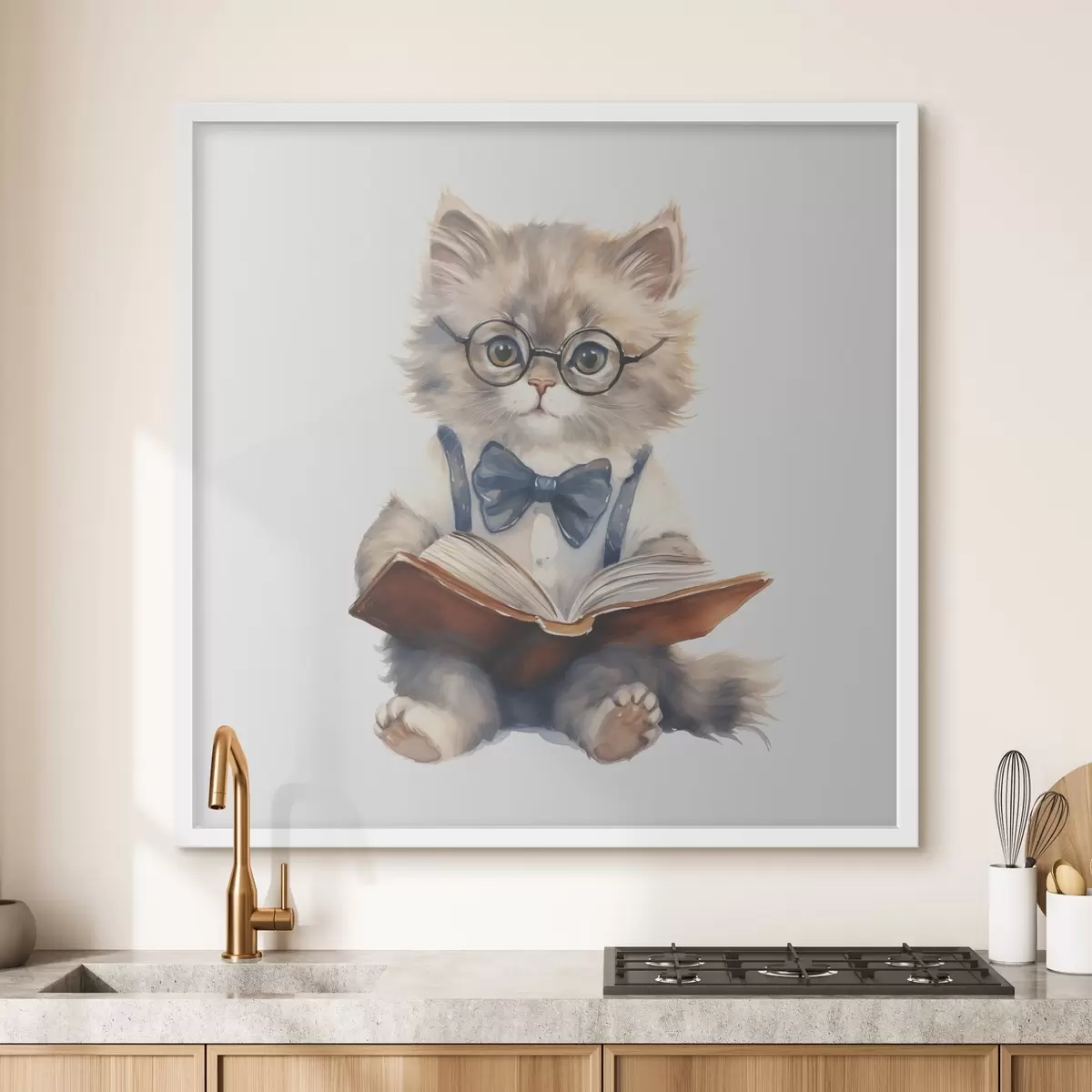 Poster Szary kotek w czarnych okularach i niebieskim garniturze czyta książkę akwarela Nr f39023