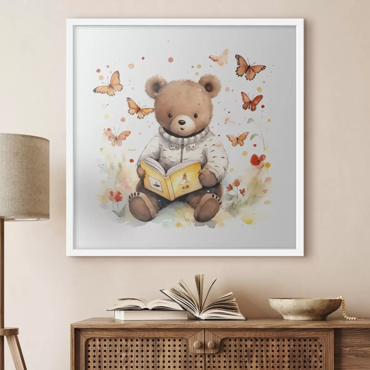 Poster Brązowy niedźwiedź w swetrze czyta książkę w otoczeniu akwarelowych motyli Nr f39025