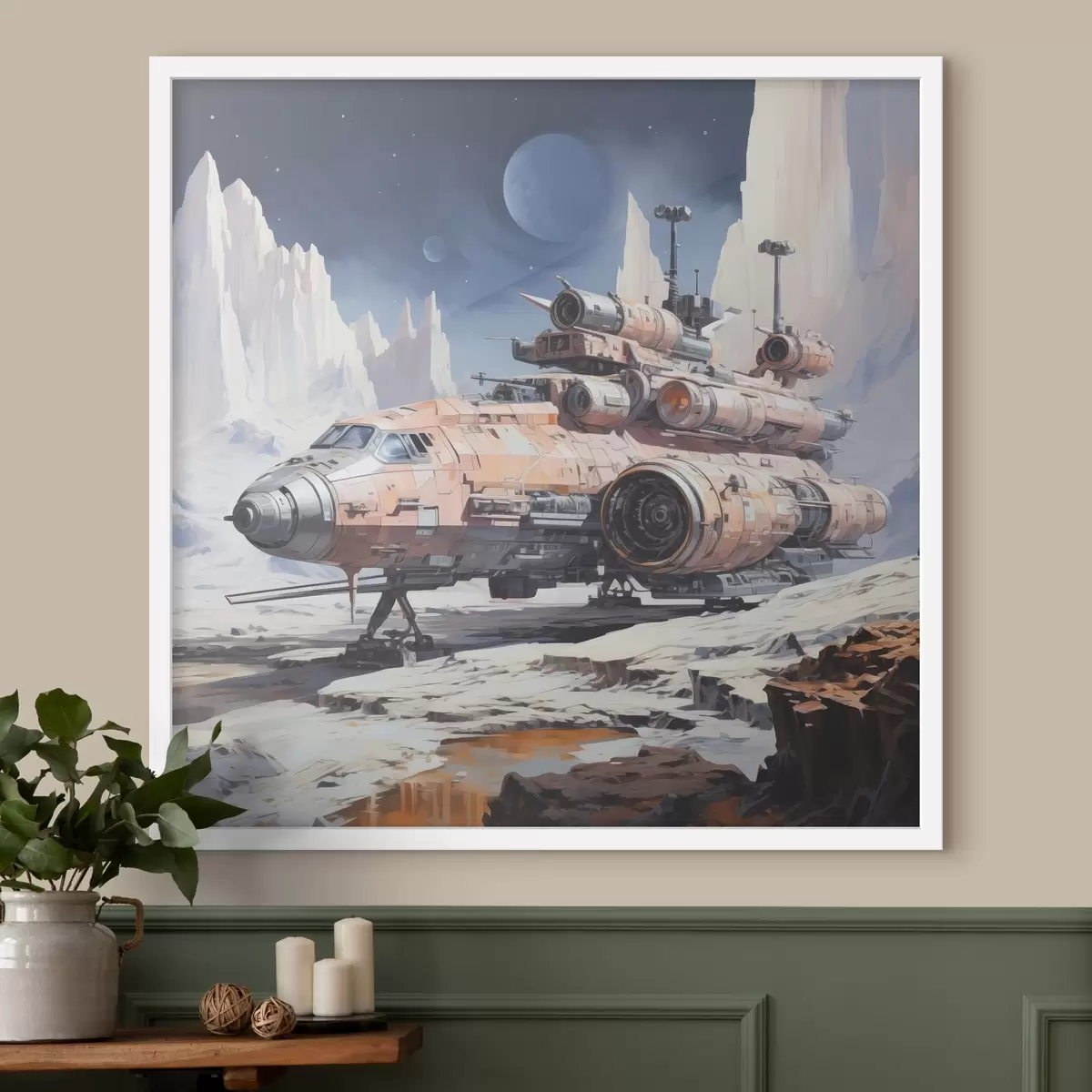 Plakat Statek kosmiczny w stylu cyberpunk stoi na powierzchni księżyca w kosmosie wśród gór, w kolorze niebieskim, beżowym i białym f39114