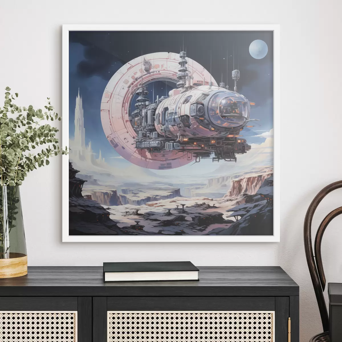 Plakat Statek kosmiczny w stylu cyberpunk leci w kosmosie nad asteroidą i planetą, kolor niebieski, beżowy, różowy, biały f39115