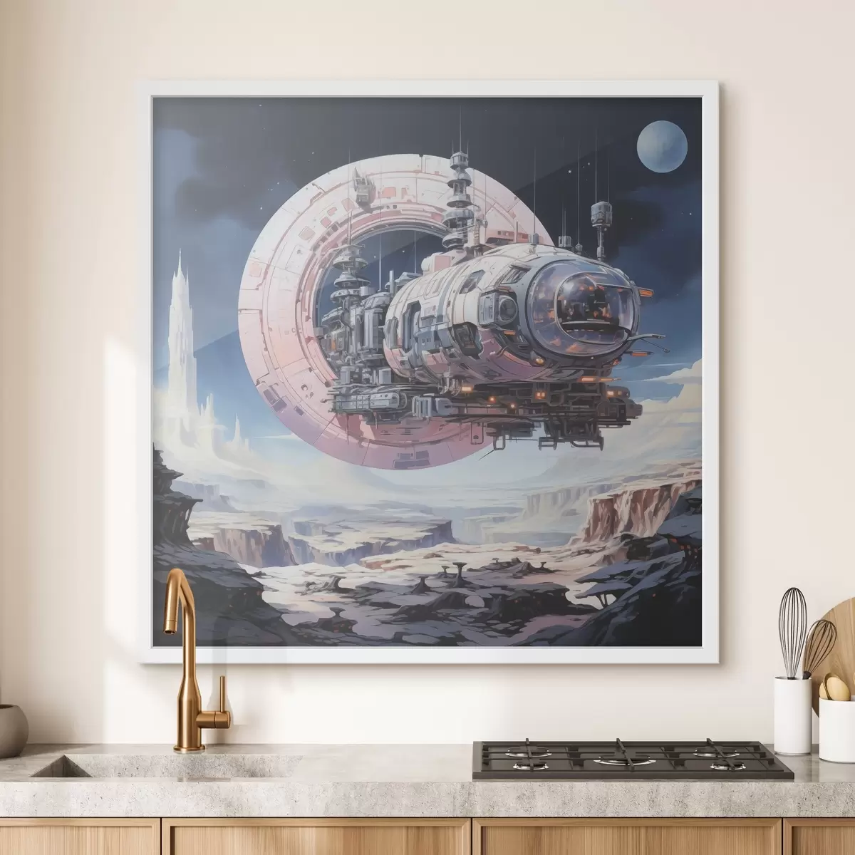 Poster Statek kosmiczny w stylu cyberpunk leci w kosmosie nad asteroidą i planetą, kolor niebieski, beżowy, różowy, biały Nr f39115
