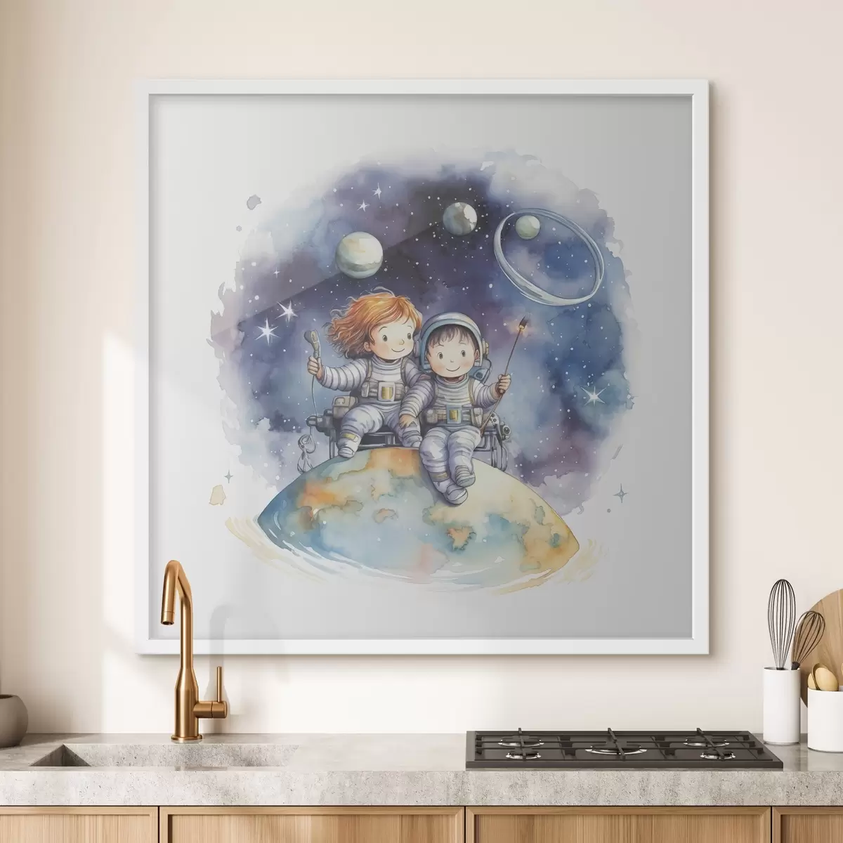 Plakat Dzieci w skafandrach kosmicznych siedzą na planecie w kosmosie akwarela ilustracja dla dzieci f39117