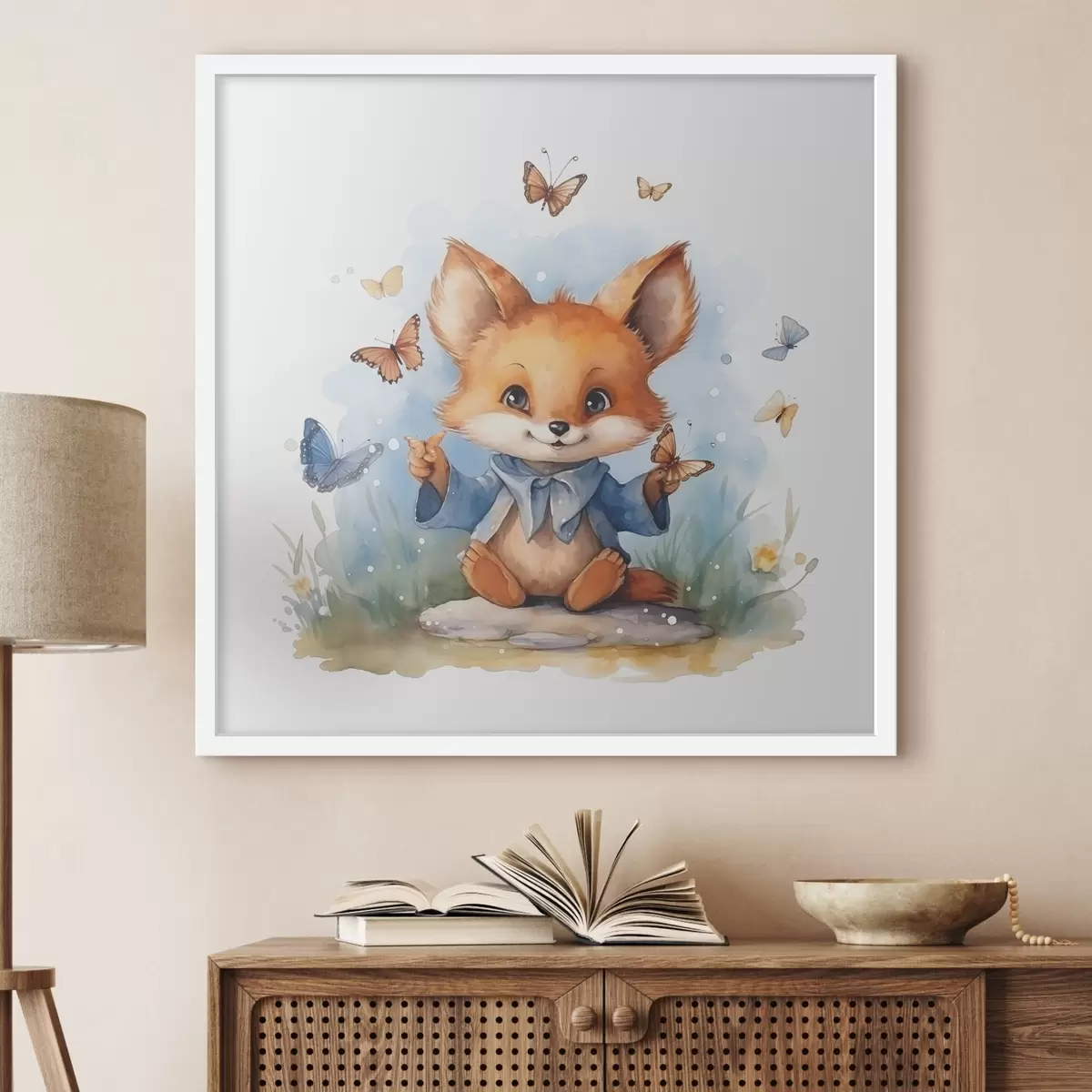 Plakat Mały lis w niebieskim garniturze siedzi na trawniku wśród latających motyli, ilustracja akwarelowa dla dzieci f39119